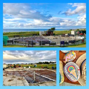 … to see so much progress on the construction of the SplashPad this evening… and one of the many beautiful wee painted stones on Hamish’s Ice Cream Bench πŸŒˆπŸ’œπŸŒˆ