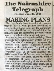 Just one excerpt from today’s Nairnshire Telegraph. There is a more extensive article within and picture on the front page. We are so delighted with the reaction so far. We urge you all to look at our proposals, either in the Community Centre (please leave comments) or on our website.