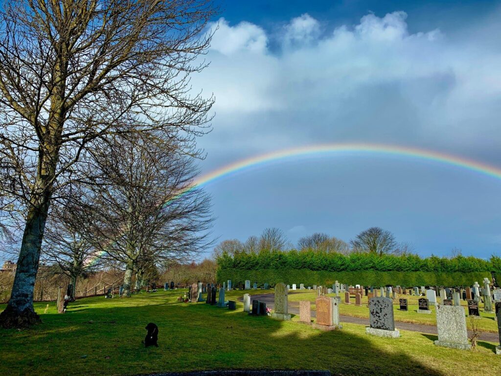 I don’t post photos of this place very often, however, this WONDERFUL RAINBOW really BRIGHTENED my today 🌈☺️ Appearing at this time of year, in this location, reminded me of why this BEAUTIFULLY COLOURFUL arc became so important to us, as a wee sign – a “Hello” from OUR PRECIOUS BOY – he rests just at the point where the rainbow touches the earth 🌈💜🌈